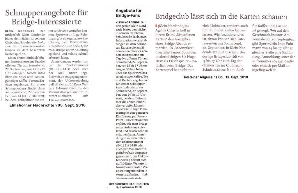 Bericht in den EN und den UeN vom 05.09.2018 sowie der Holsteiner Allgemeine vom 19.09.2018 (zum Vergrößern hier klicken)
